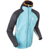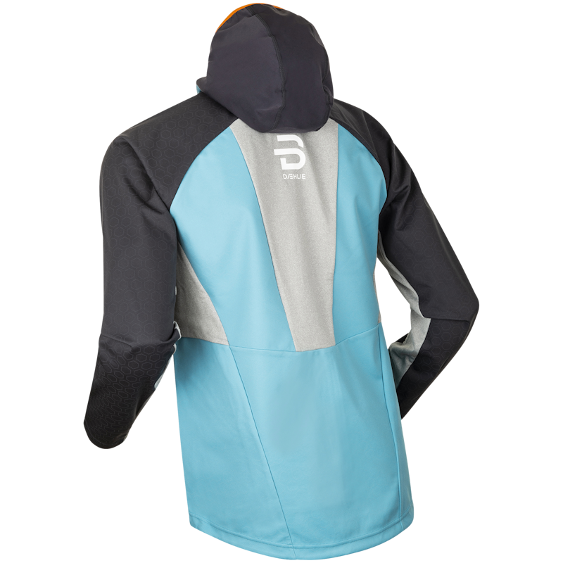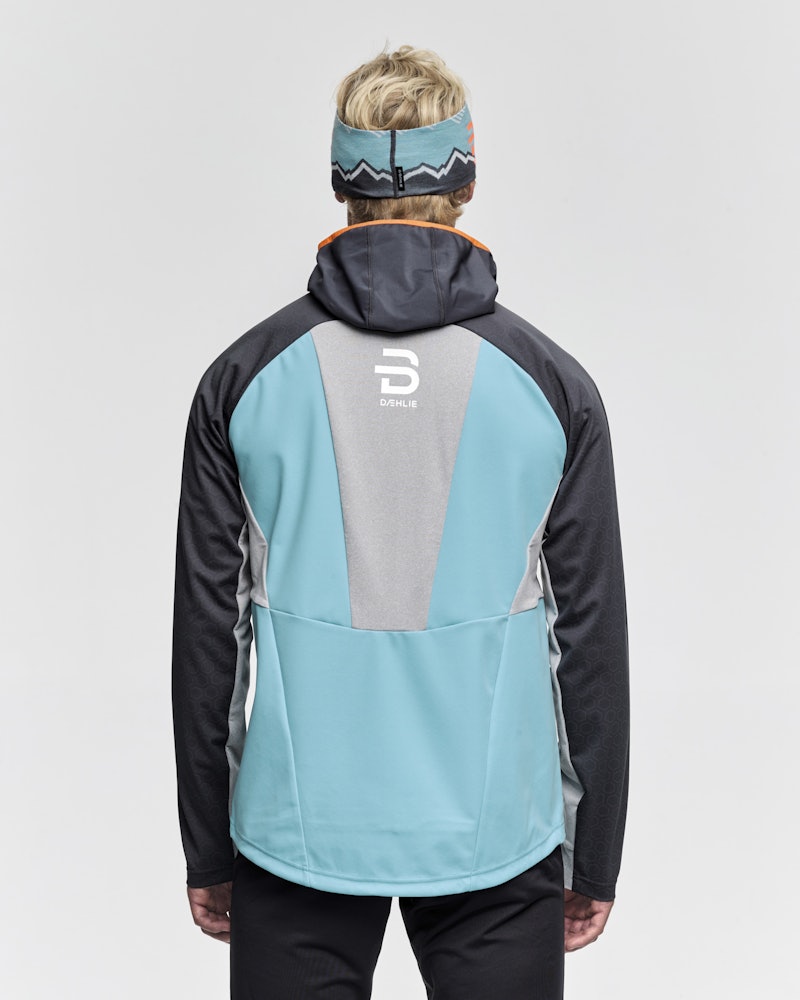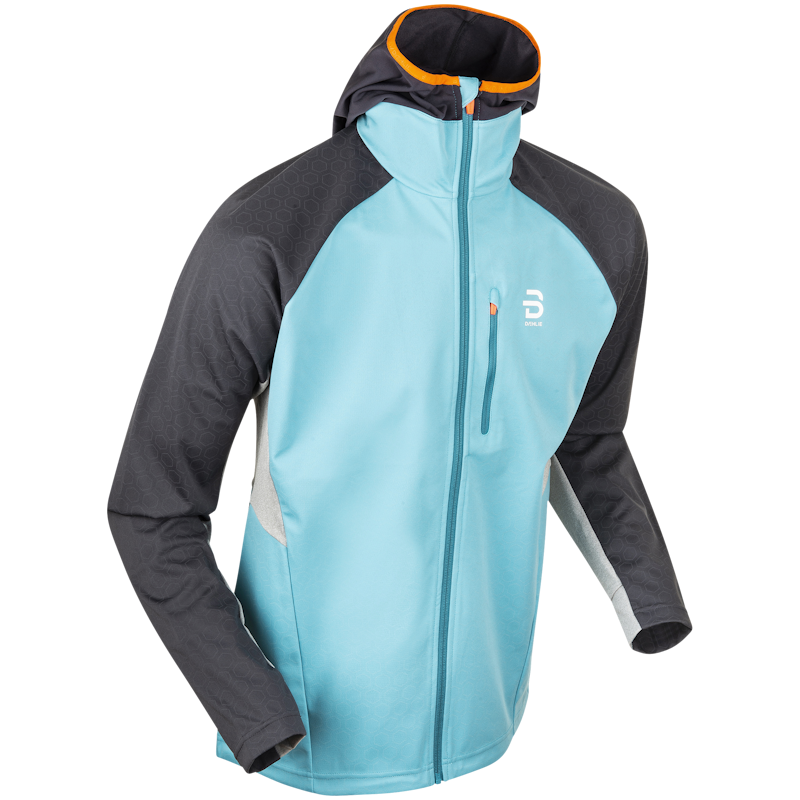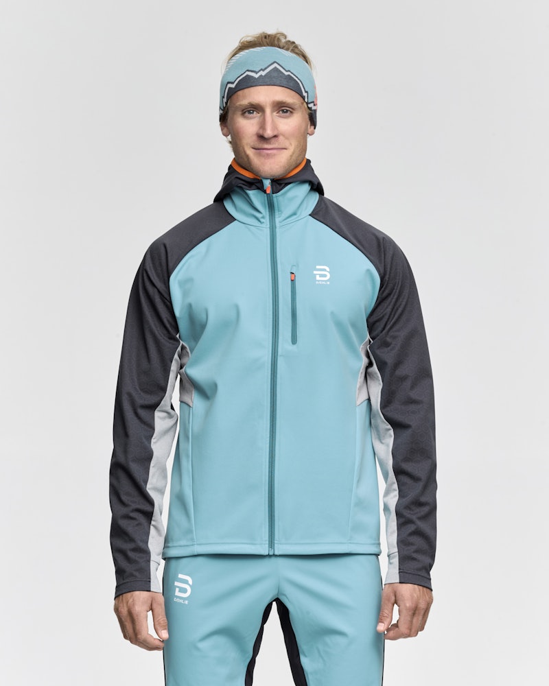 Jacket North er en langrennsjakke med hette ment for trening med moderat intensitet. Vind- og vannavvisende 3-lags softshell i front, på ermene og deler av ryggen.