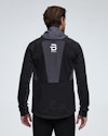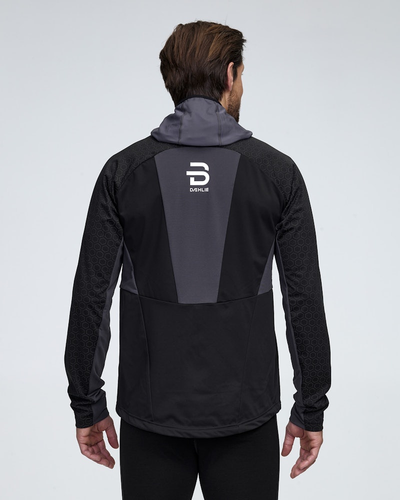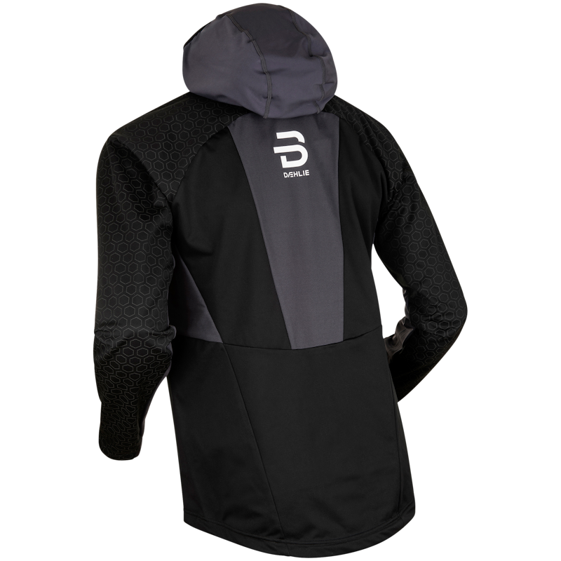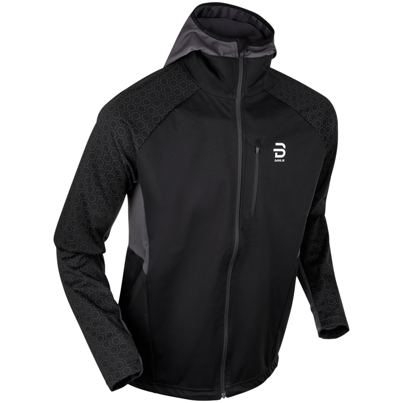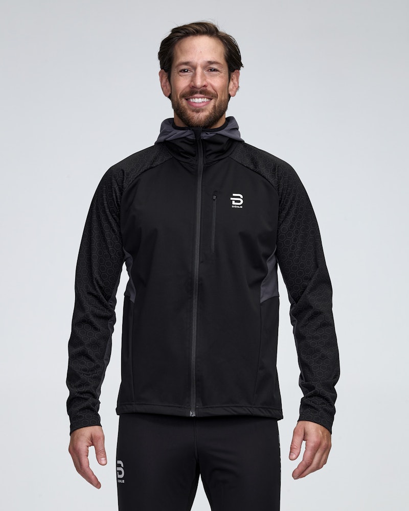 Jacket North is a hooded cross-country jacket meant for moderate-intensity training. Wind- and water-repellent 3-layer softshell in front, on the arms, and parts of the back. Bionic Finish Eco® technology on the fabric surface ensures that light rain and sleet run-off. Mesh panels below the arms and on the back provide optimal ventilation and mobility. The jacket has a higher neck than average and a lightweight hood with a brushed interior that provides good insulation. One zippered chest pocket. Interior drawstring at the bottom of the jacket for an individualized fit. A cool pattern appears in the softshell material when the temperature drops below.
